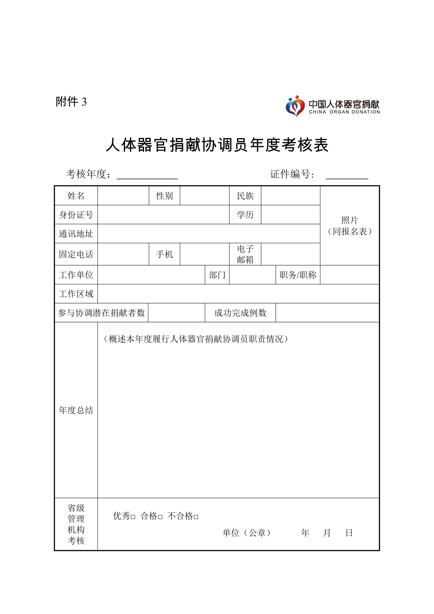 (一)省级管理机构每年对协调员进行年度考核,由协调员填写《人体器官捐献协调员年度考核表》(附件3),由省级管理机构提出考核意见,考核结果分优秀、合格、不合格三个等级;
