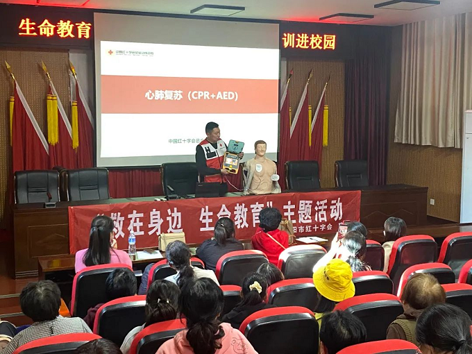活动中,市红十字培训中心李国锋老师以生动的语言,采用互动的方式,详细讲解了心肺复苏术、AED使用、气道异物梗塞处理及现场救护的处理等知识,并现场进行示范操作。